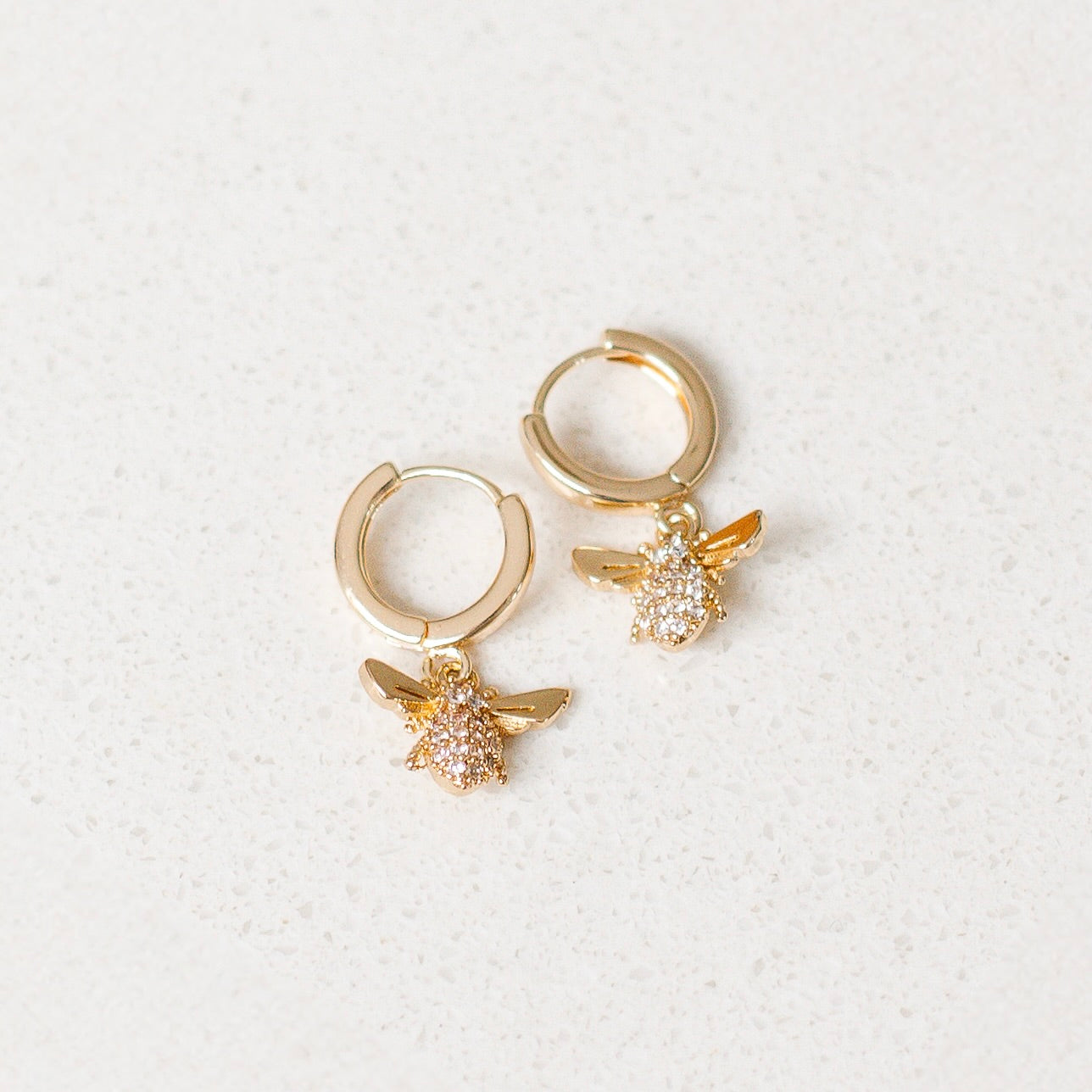 Gold plated plain hoops with a delicate bee charm with clear cubic zirconia stone details.