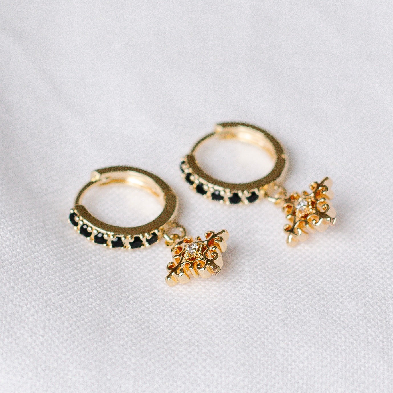 Gold plated hoops with black cubic zirconia detail and a filigree charm with clear cubic zirconia stone.