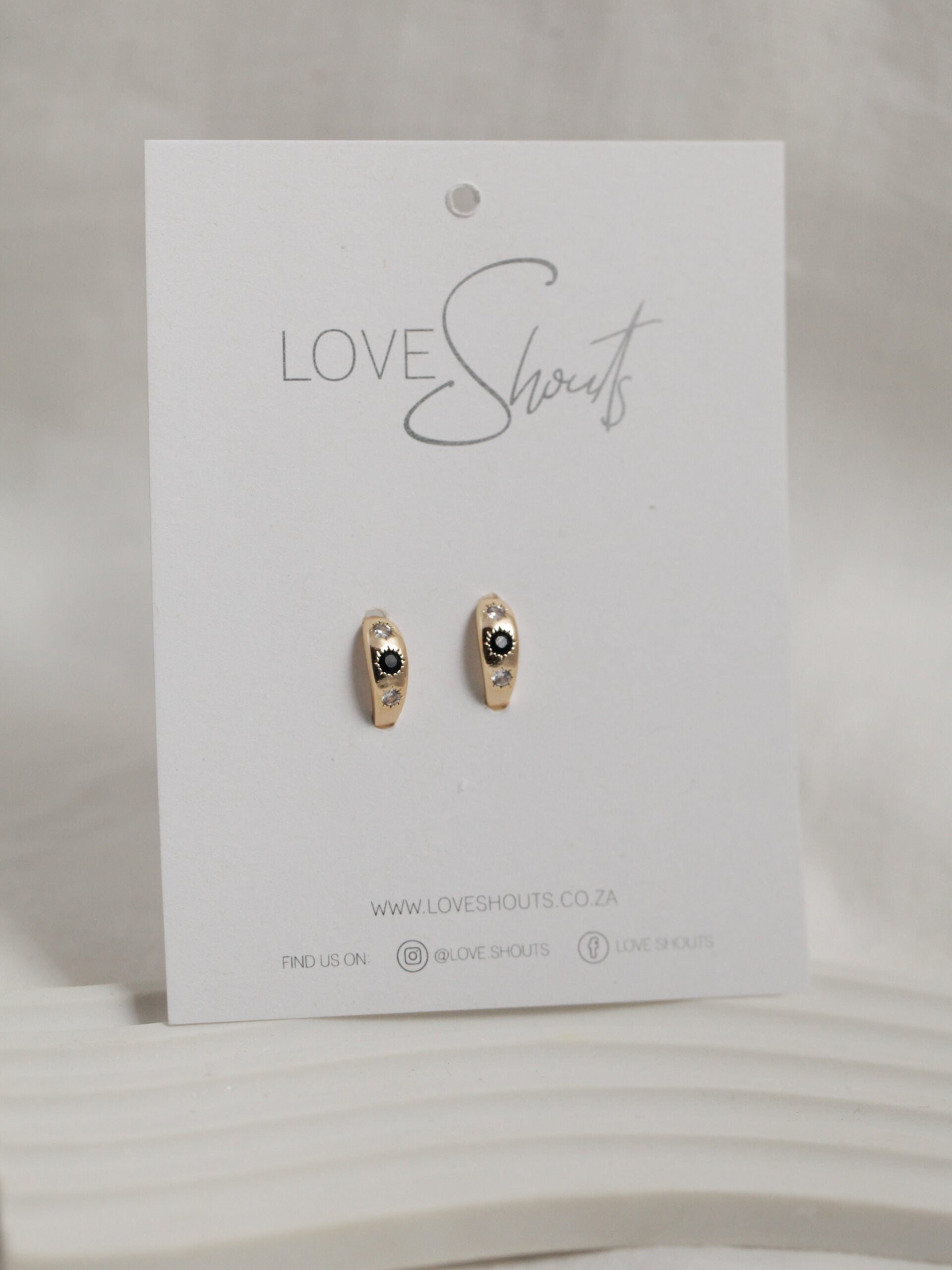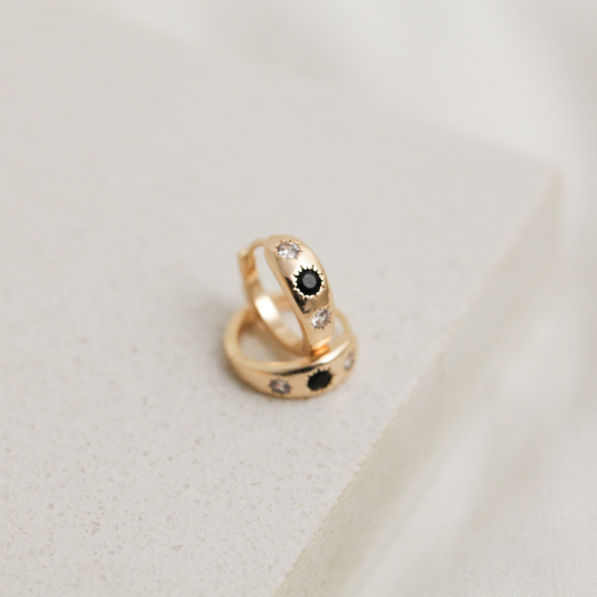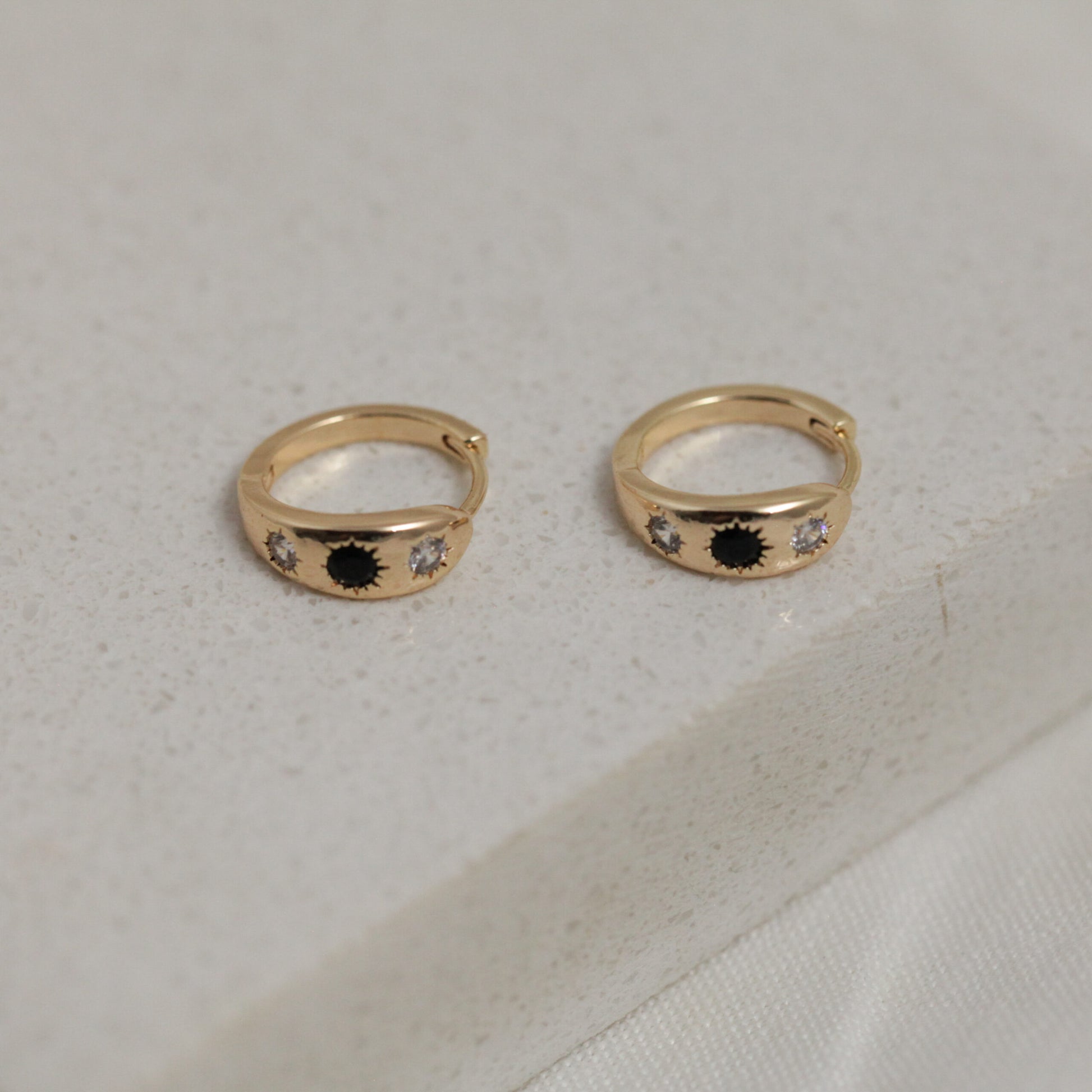 Gold plated hoops with a clear and black cubic zirconia stones