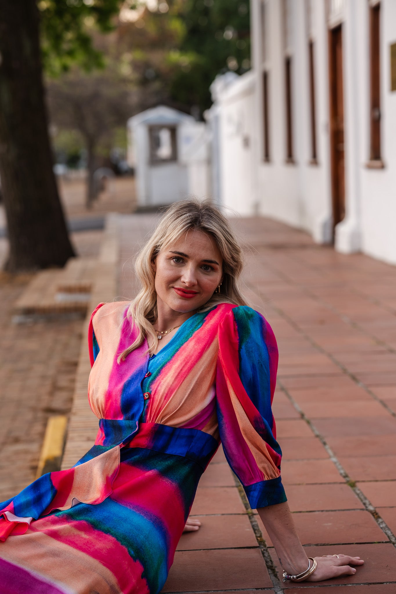 This wrap dress is made in a printed Spanish viscose and wrapped in locally-made love. The striped tiers are blocked to form beautiful designs. It is finished off with wood-like buttons and an inner press stud (keeping everything secure). The sleeves have a cuffed hem that finishes off to be a ballerina sleeve length.