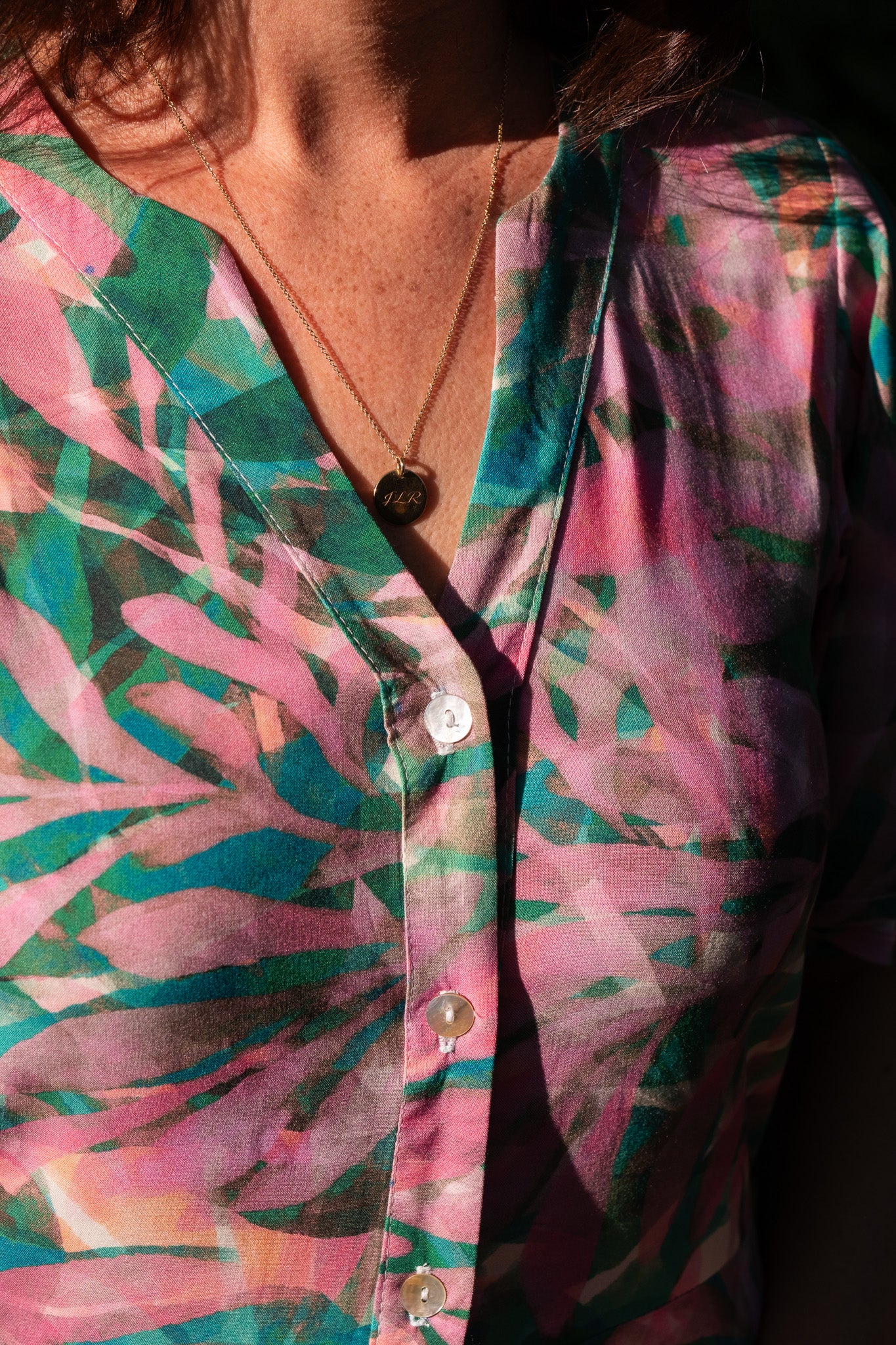 This fit and flare dress is made from a Spanish viscose in a pink and green festive palm tree print.