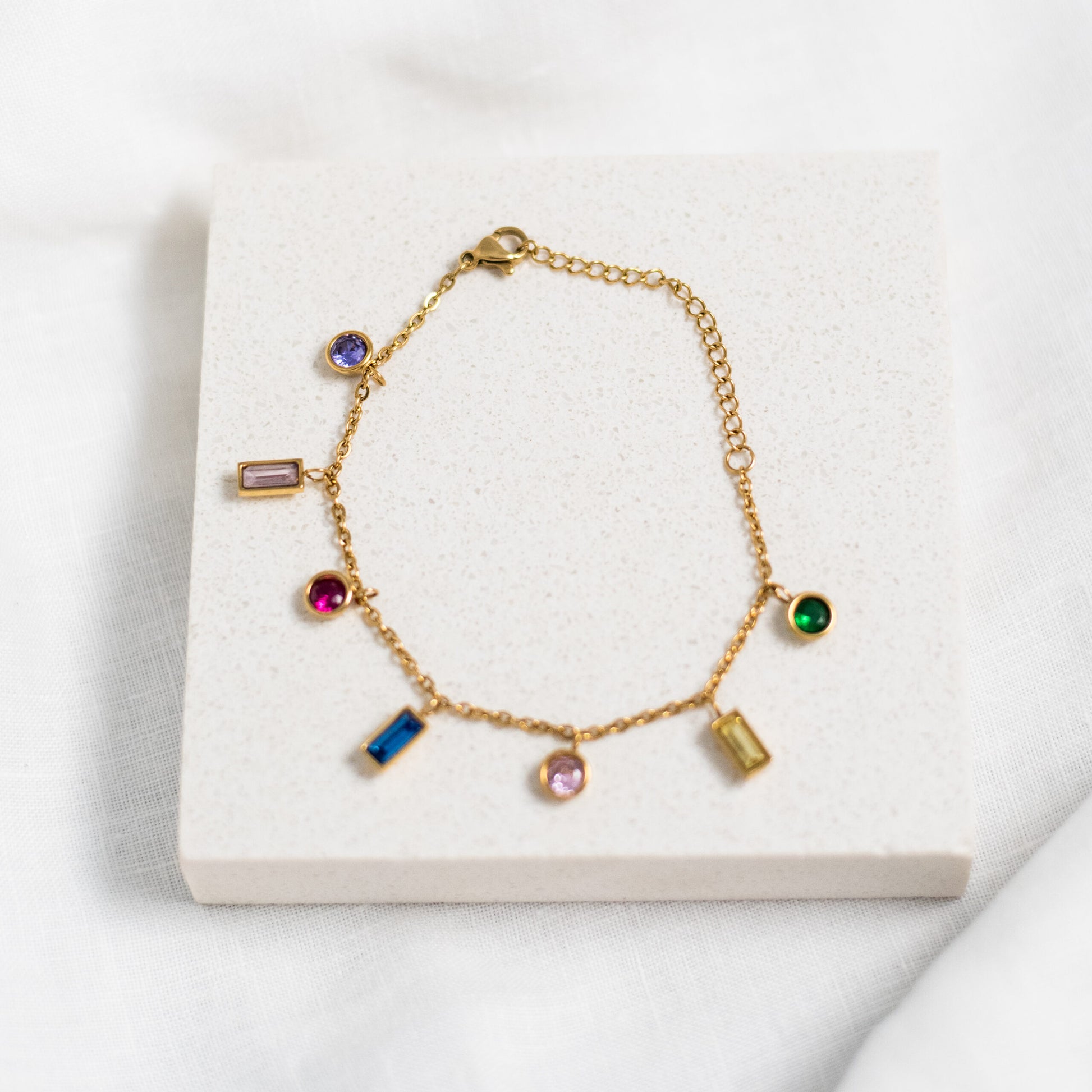Gold plated bracelet with cubic zirconia charms.
