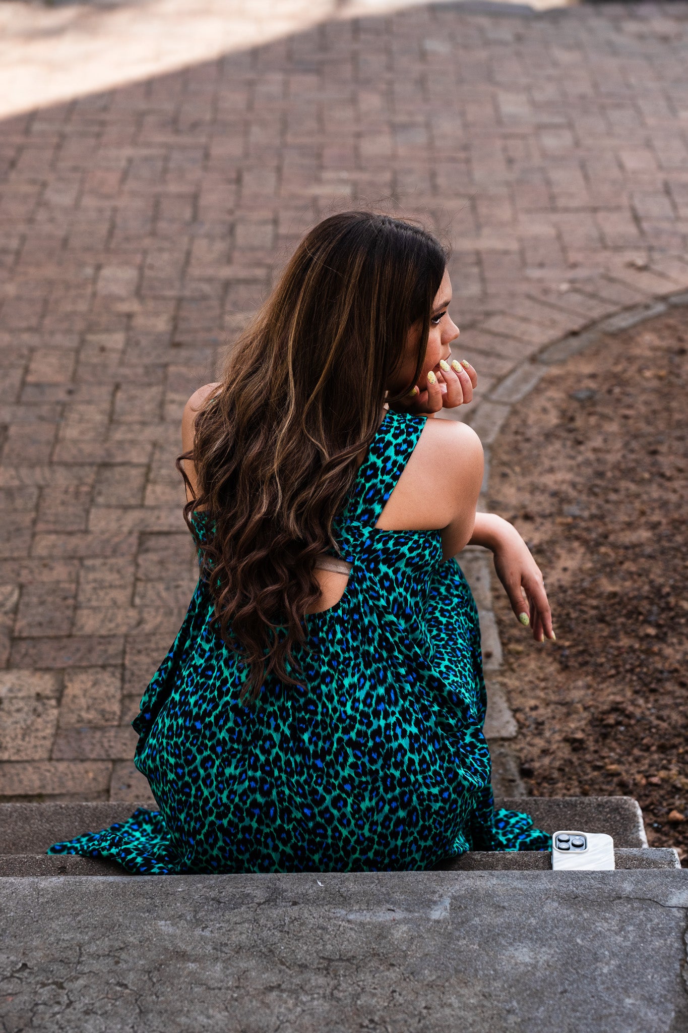 This dress is a below-the-knee length style. The cut-out detail on the back has been raised and improved for a bra-friendly or more modest fit.