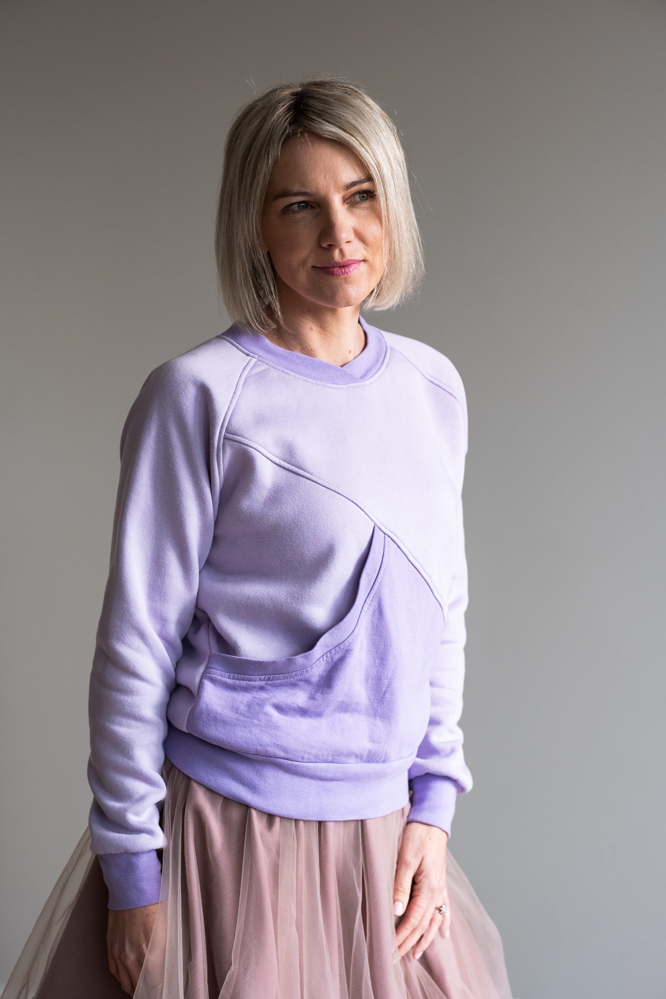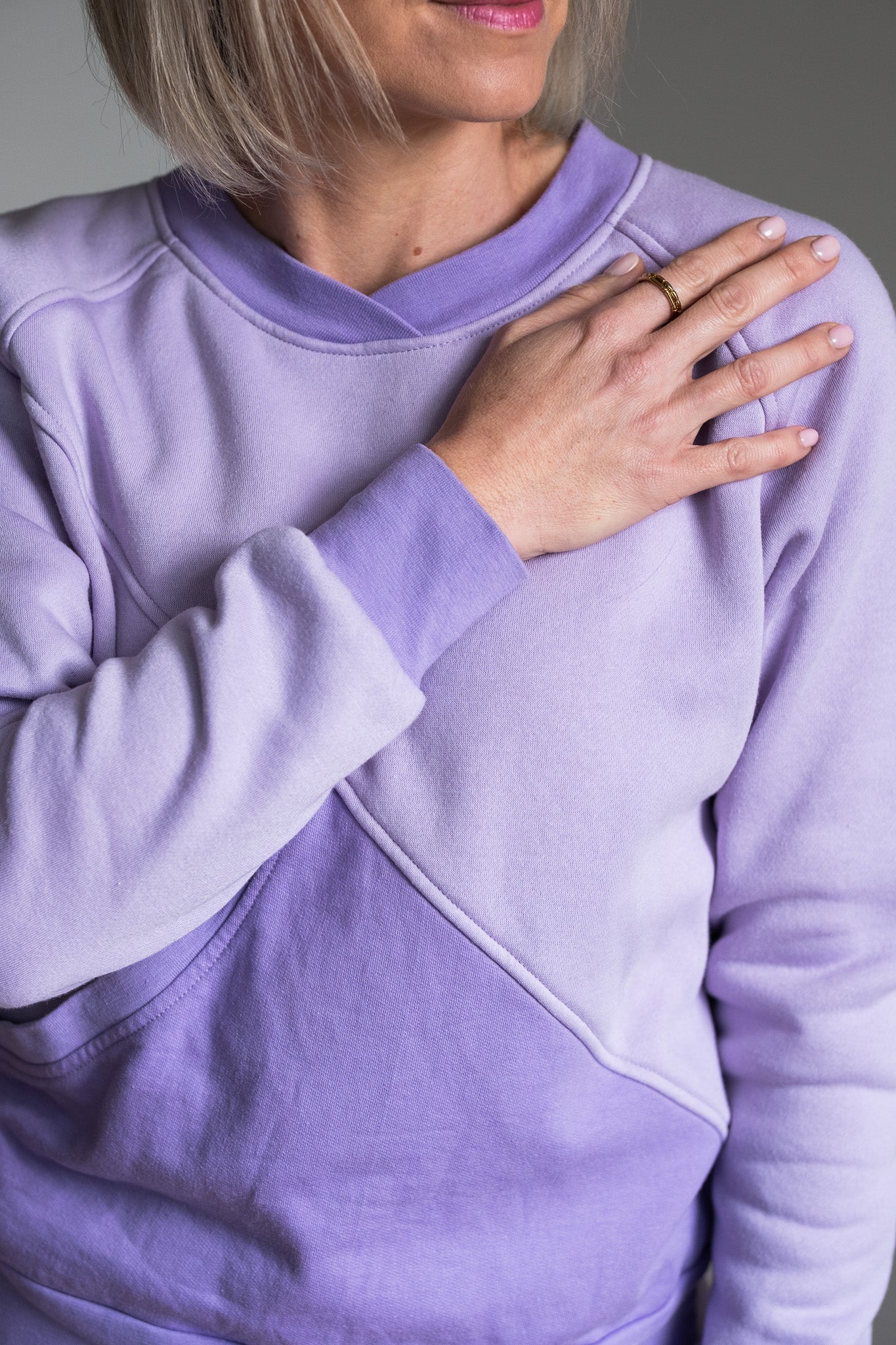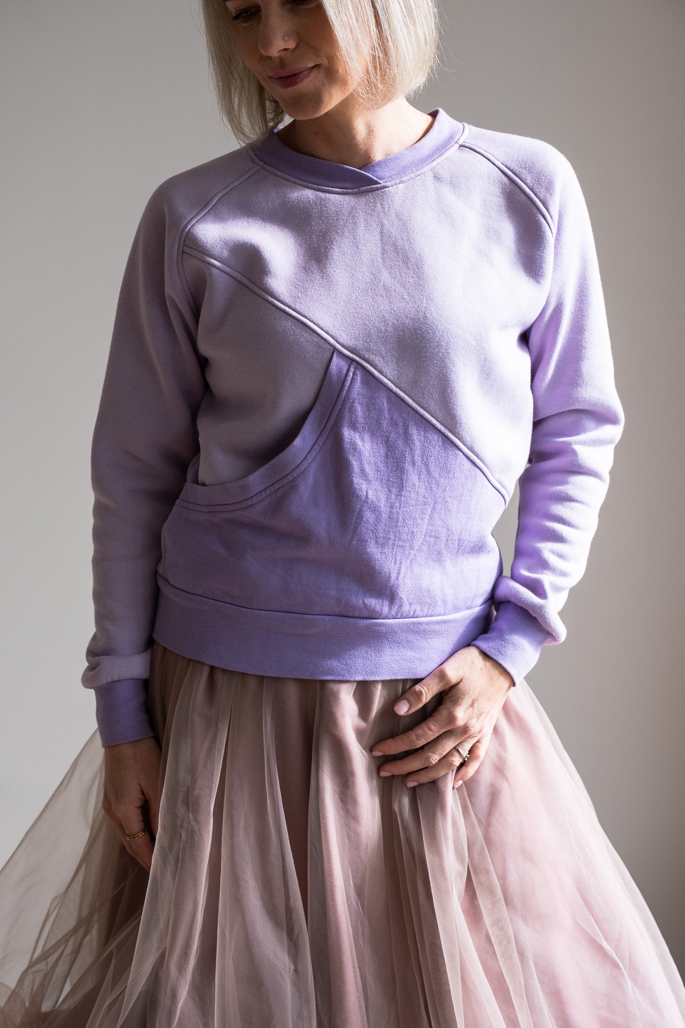 The sweat top was created with a fun fabric or colour block look by creating a diagonal pocket. It is warm and soft. Made from a 240 grams brushed combination of 100% cotton and poly cotton fleece with matching rib.