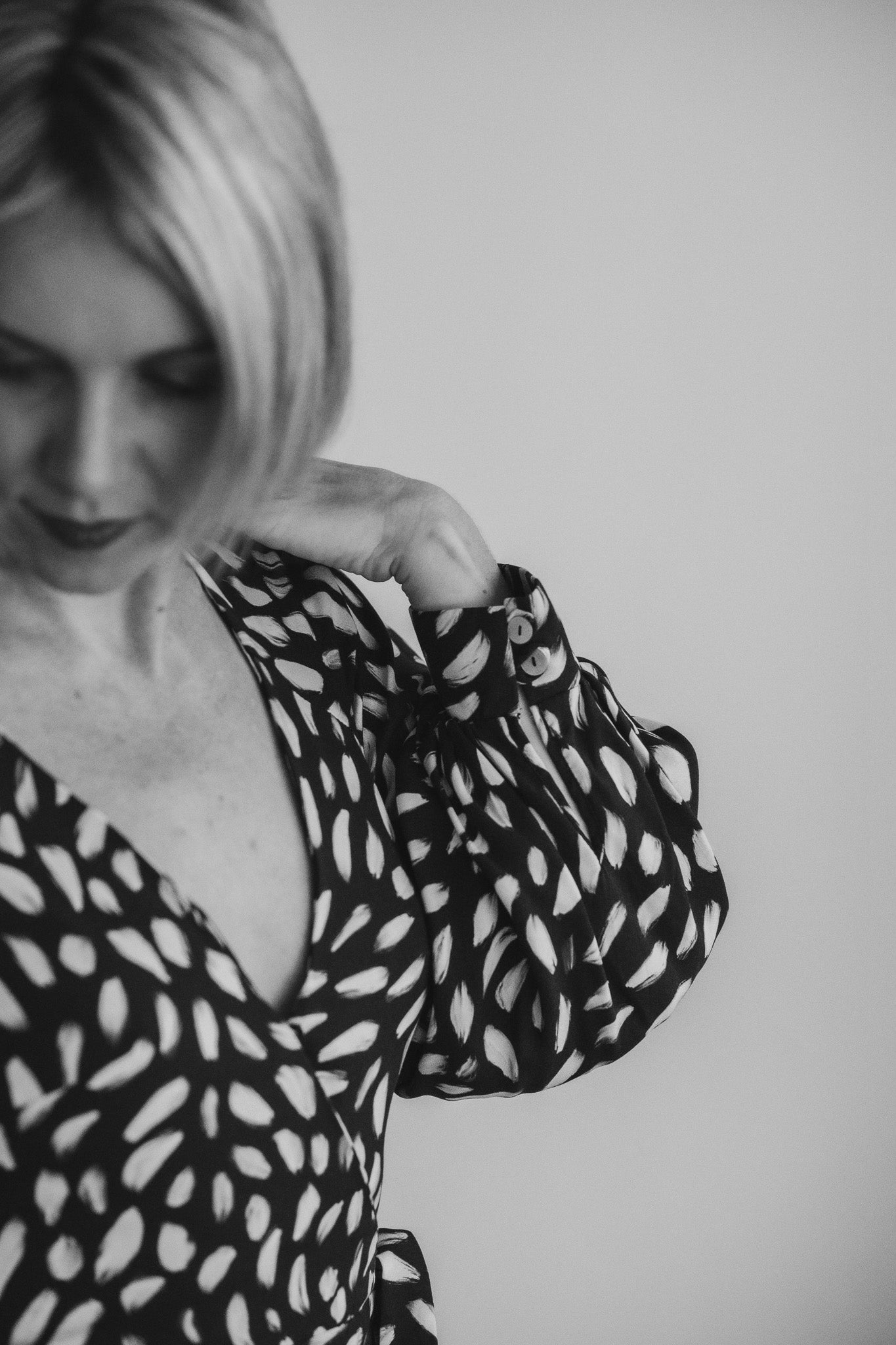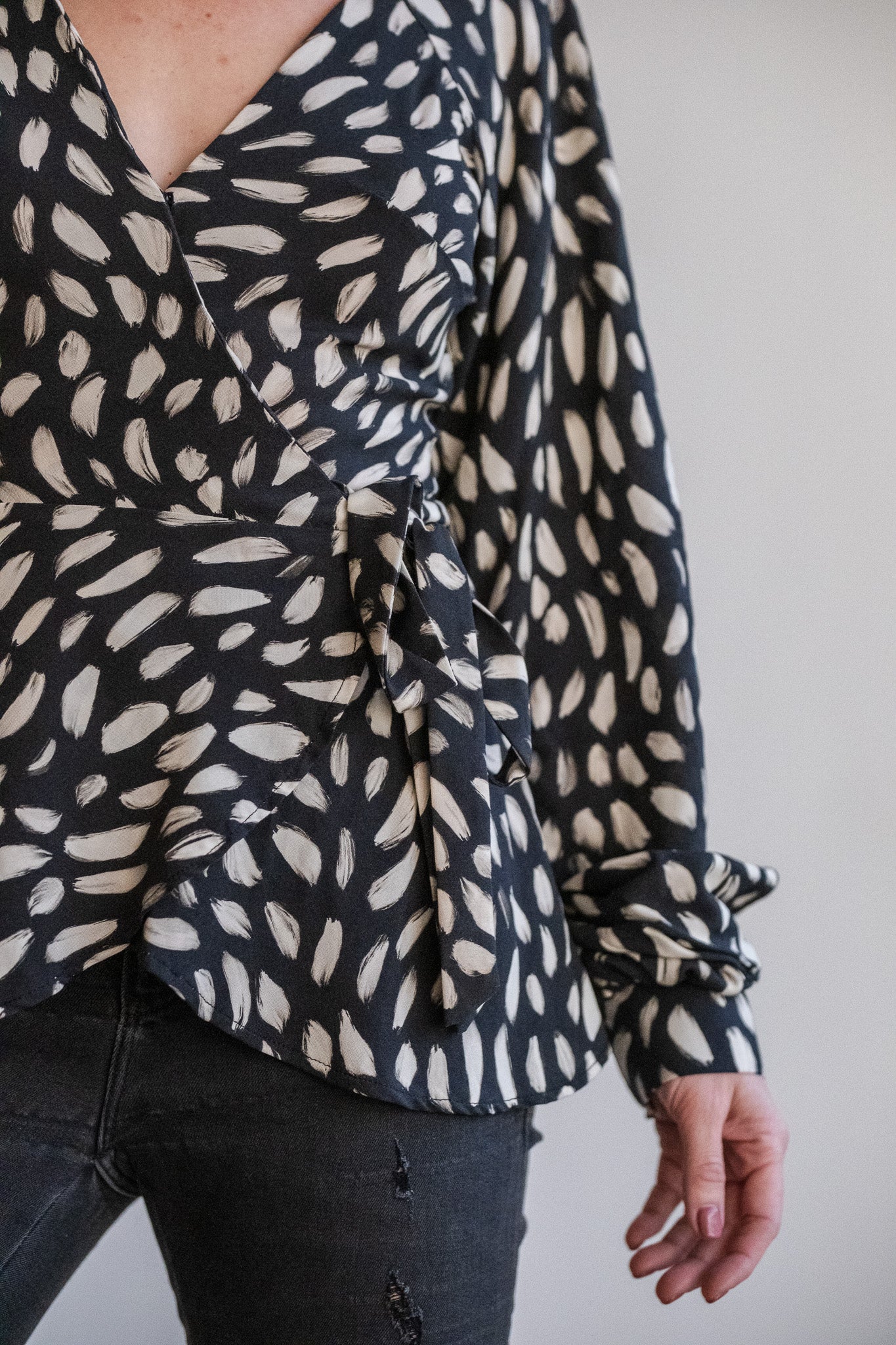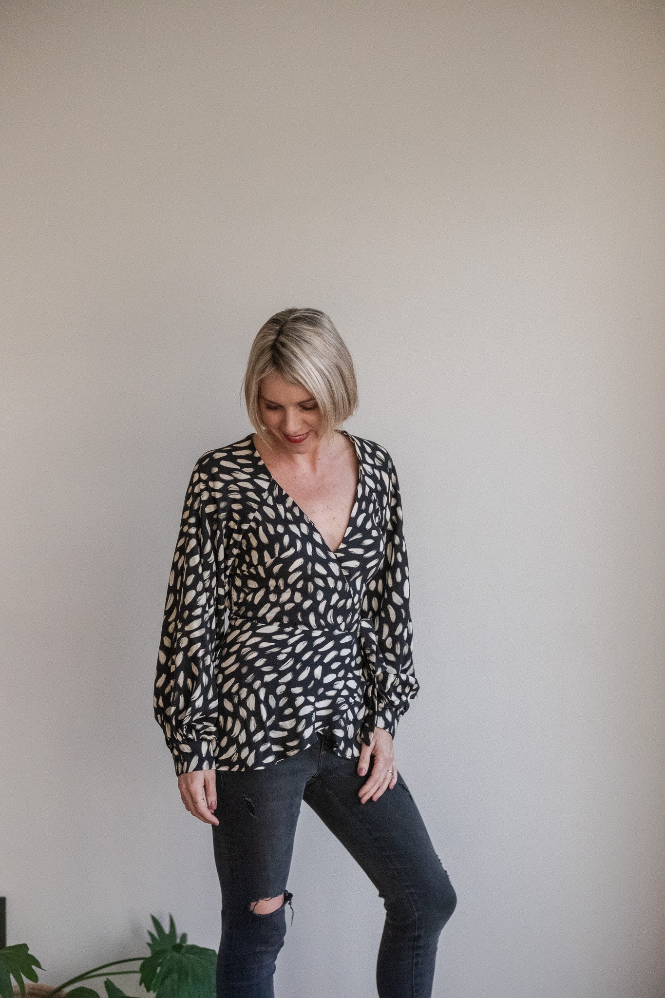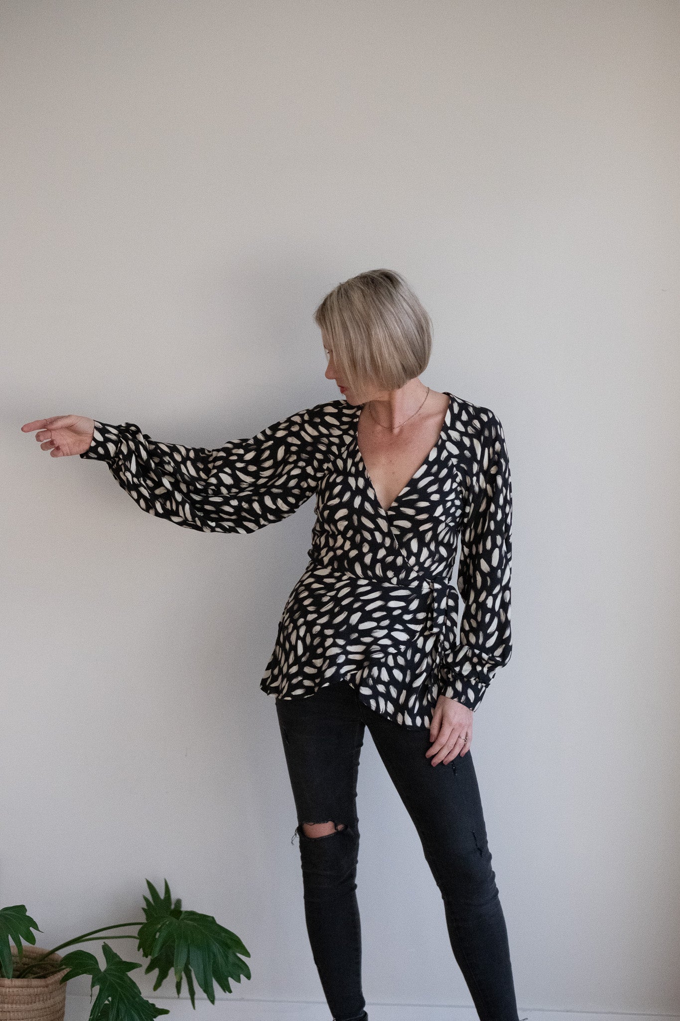 This is a wrap blouse that suits every figure with a curved tier hem. It is longer length to cover those kidneys (like my grand mother used to say) and elegantly finished off with a blouson sleeve and cuff detail.