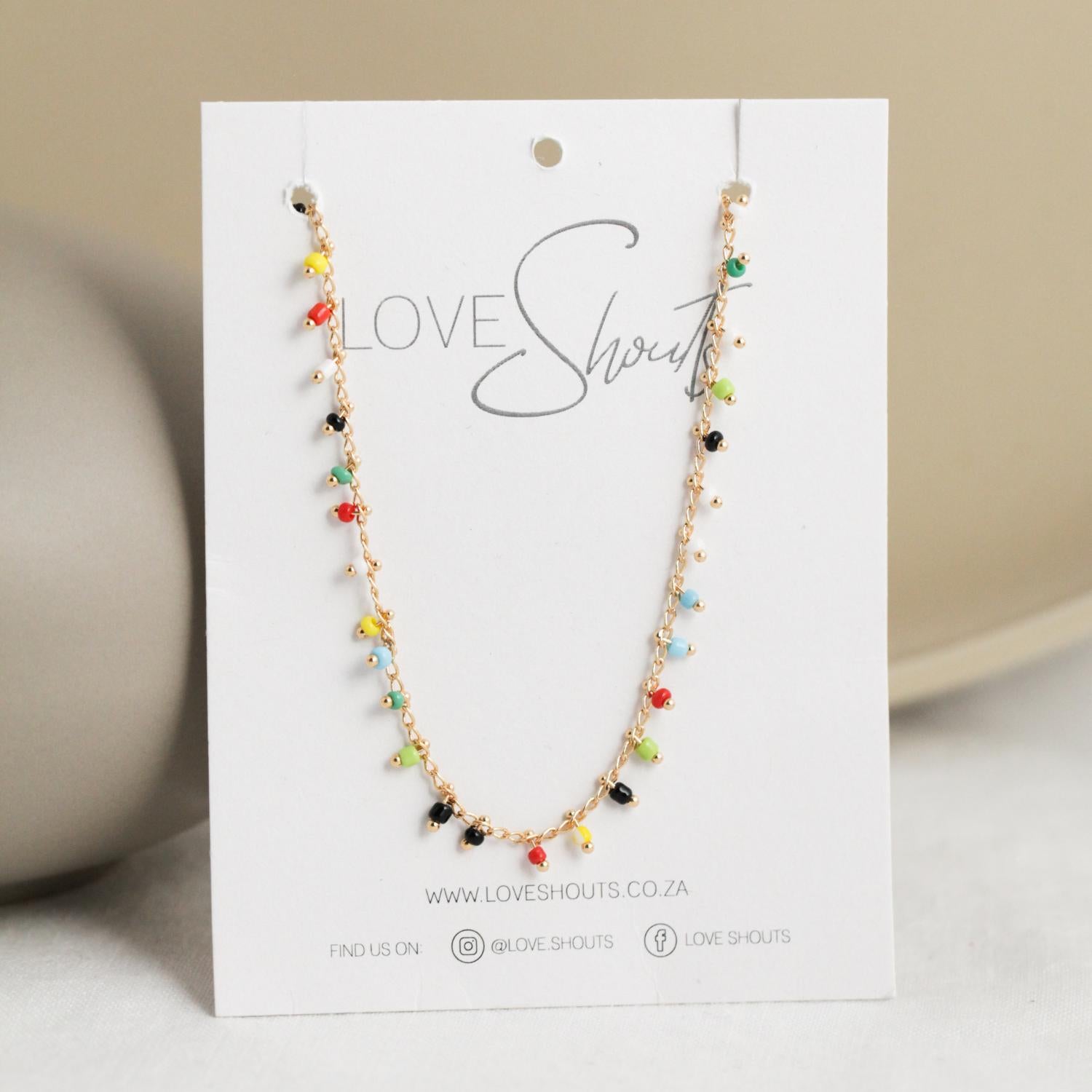 Gold plated necklace with multiple coloured beads.