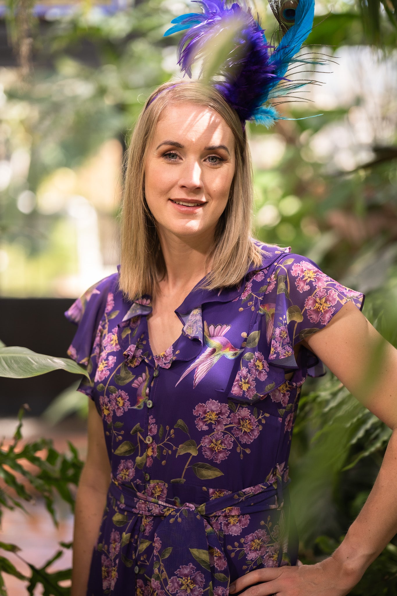 The Thankfulness dress is made from a beautiful hummingbird Kelly Higgs painting, printed on chiffon. It's a gorgeous button through frill dress with pockets and a belt! Fully lined. You won't get more pretty and feminine than this!