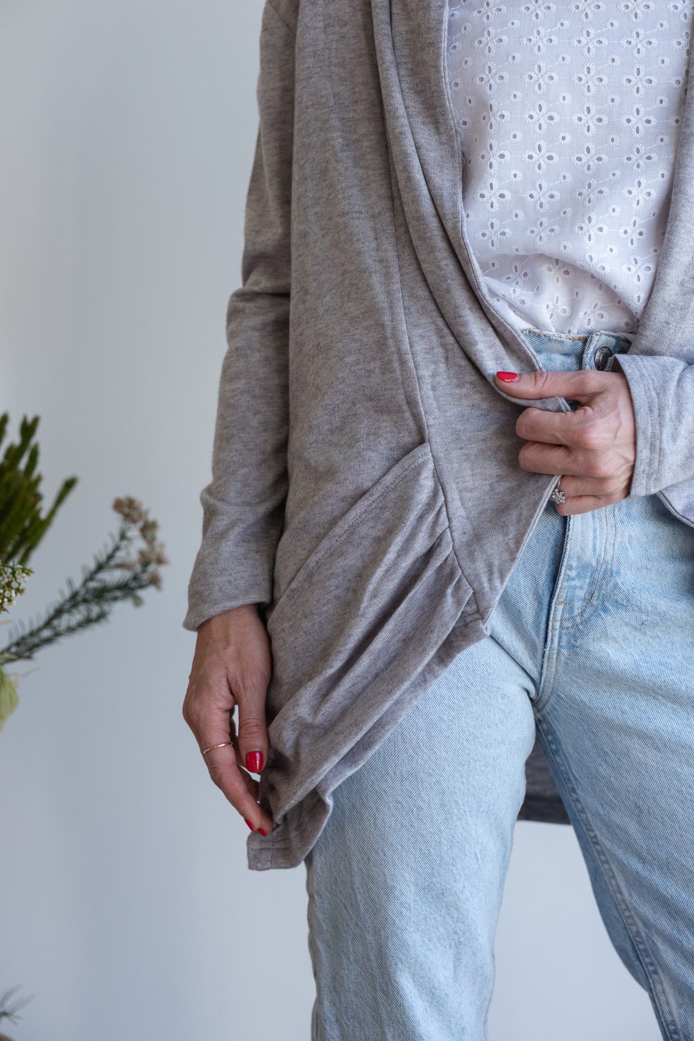 A lovely longer length covering peace for those cooler summer days or nights. Romantic side pockets adds a beautiful touch.