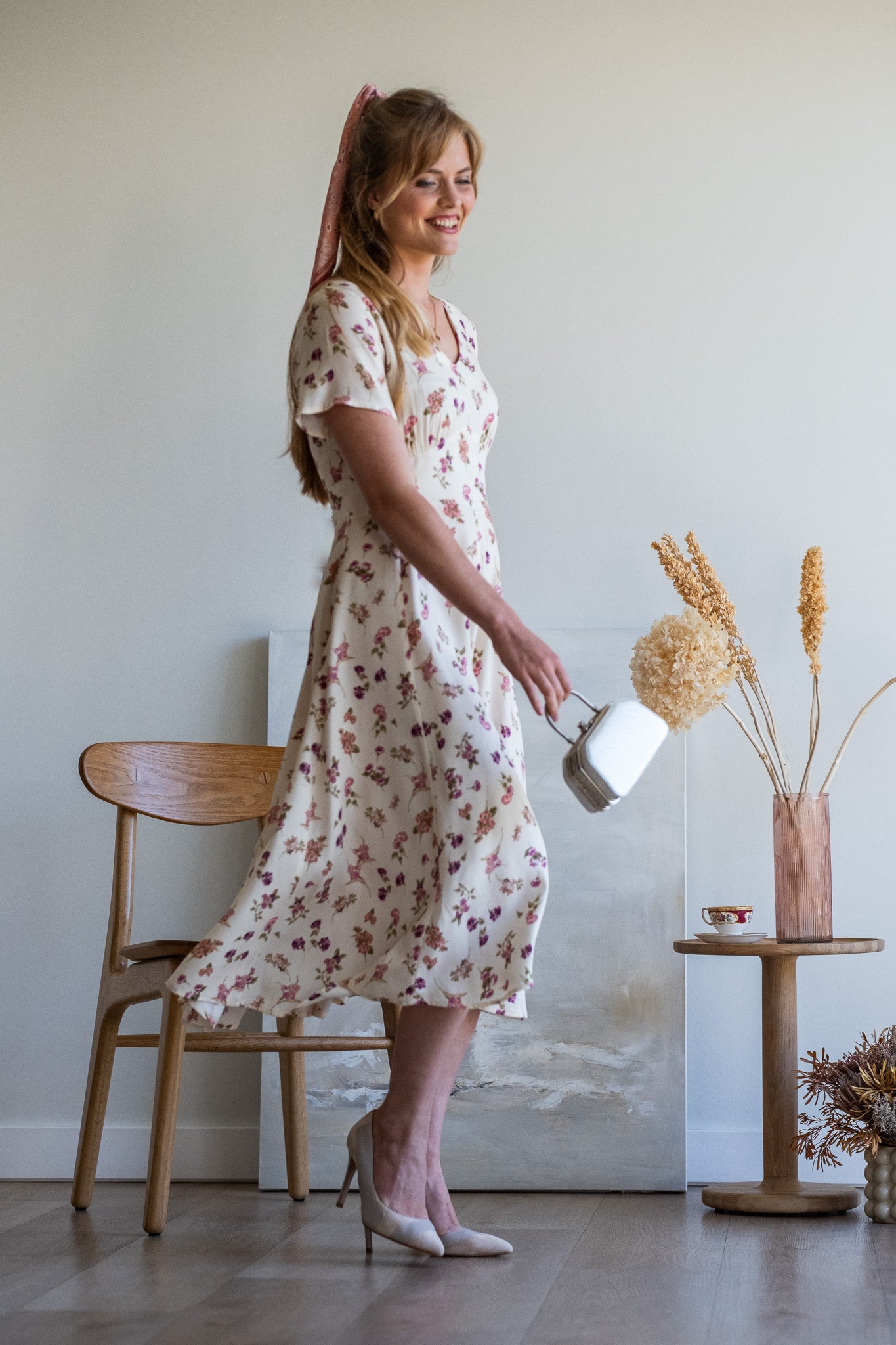 This is a classic vintage dress. Add stockings and a faux fur coat for cooler days, down dress with a denim jacket and ankle boots or keep it simple like our images with a classic court shoe.